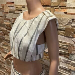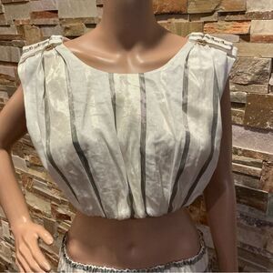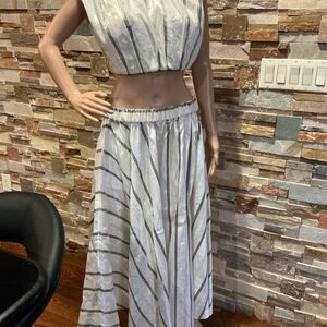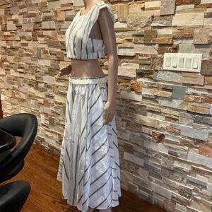 Chic skirt set with elegant stripes. Perfect for stylish outings. Color: Champagne Stripe. Excellent condition. Made in Australia.