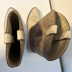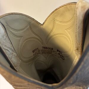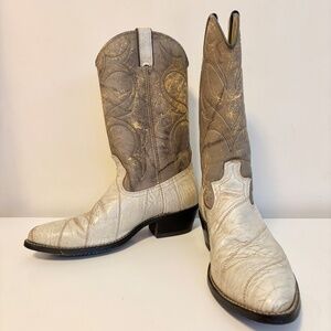 Acme 5971 Two Toned Cowhide Suede Leather Embossed Grain Print Western Cowboy Boots in Grey and Cream Color and Mens US Shoe Size 9.5. Gently used and in good condition with wear on shaft and soles.