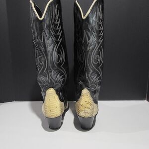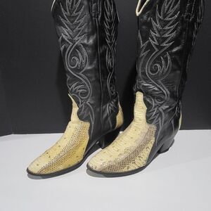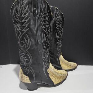 Stylish black and tan cowgirl boots with intricate stitching. Perfect for a western look. Light & normal wear.