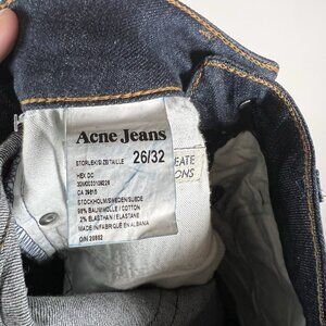 The product is a pair of Acne Jeans in men's size W26 L32. These designer jeans feature a solid blue color with a medium fabric wash, made from cotton material. They have a slim fit and a zip and button closure, with a 5-pocket design and a straight style. The jeans are machine washable and have accents like logos and a vintage look, suitable for various themes such as biker, punk, and hipster. They offer comfort and are perfect for the summer, fall, and spring seasons.