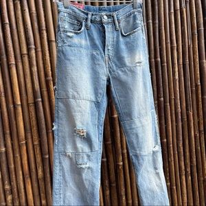 Acne Studios Blå Konst, midrise straight fit, button fly, regular length, features non stretch denim with fading, whiskering, distressing and tonal trims throughout.
