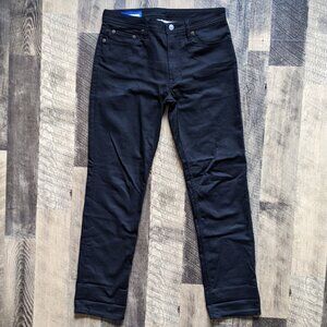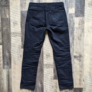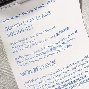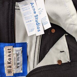 These are Acne Studios Bla Konst South Jeans in the color Stay Black. They are in excellent condition. They are a size 29 x 32, and the last two images show measurements. Mid-rise, slim straight-leg, five-pocket style, zip fly with button closure. Slightly stretchy denim fabric made of 94% cotton, 5% polyester, and 1% elastane. Style# 30L165-131