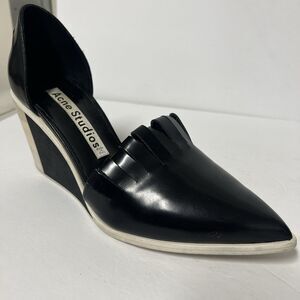 Acne Studios Black Patent D’Orsay Wedge Heels 39 US 8.5 Fringe Vamp Sculptural
