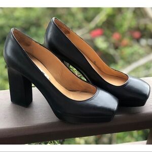 Acne Studios women's black leather square toe 1” platform 4” high block heel pumps with square toes. So on trend right now! Shoes are a woman's EUR size 37 which translates to a US size 6.5/7.