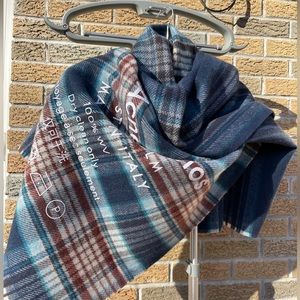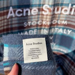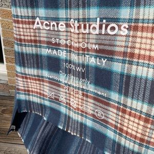 Wrap yourself in luxury with this Acne Studios Checked Wool Scarf. Never worn and in excellent condition, this scarf features a classic blanket check pattern with a large, statement-making care label print. Crafted from heavy, felted wool, it provides ample warmth and a touch of sophistication to any outfit. Generously sized at 70 cm x 220 cm (27.56 in x 86.61 in), it's a versatile accessory that can be styled in various ways. Made from 100% wool, this scarf is a must-have for those looking to combine comfort with high-end fashion.