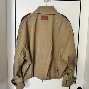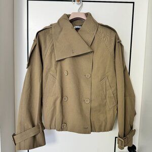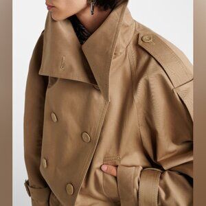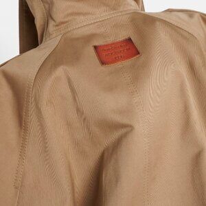 This trench-style jacket is crafted from cotton twill and features an elongated neckline and pleated finishes at the bottom hem.