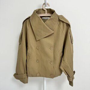 Twill Trench Jacket from Acne Studios. Trendy jacket designed for a relaxed and cropped fit. Made from cotton with a distinct twill texture. Features an elongated collar and pleated hem for an elegant silhouette. Detailed with trench-inspired shoulder tabs and a leather logo patch at the back. The jacket includes a front button closure, both outer and inner pockets, and a length that falls just below the waist.