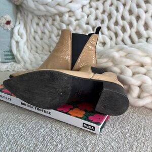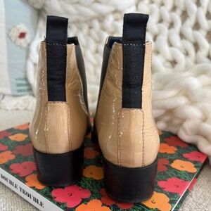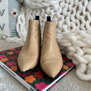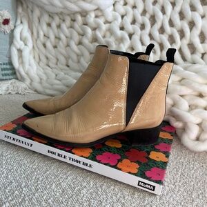 Super chic pointed toe Chelsea boot in a tan patent leather.