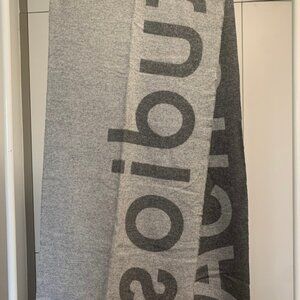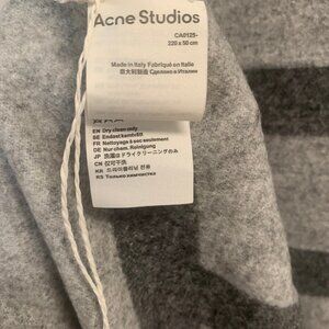 Brand new Acne Studios oversized scarf in a stylish gray colorway. Features the signature Acne Studios logo in a bold, reversible jacquard knit. Made in Italy from a soft wool blend (70% wool, 25% nylon, 5% other fibers), this scarf is both warm and lightweight. Size: 220 x 50 cm. A cozy and fashionable accessory for the cold season.