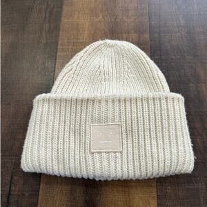 Acne Studios Pansy Cream Logo Ribbed Wool Face Beanie