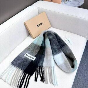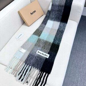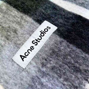 Stylish plaid wool scarf by Acne Studios. Features a blend of black, gray, and cream colors.