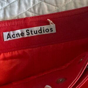 Luxury statement piece from Acne Studios, crafted from buttery-soft lamb leather in a bold cherry red hue. Features silver-tone snap hardware, front patch pocket detailing, and a clean A-line silhouette with full interior lining. Made in Turkey.