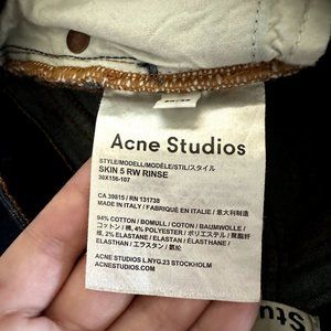 Acne Studios Skin 5 Raw Rinse Jeans. Deep indigo raw denim signature 'Skin 5' skinny jean with cropped leg. Stretch fit. Tapering from knee. Orange topstitching throughout. Classic five pocket design. Logo embossed rivets. Color: Raw Rinse. 94% Cotton, 4% Polyester, 2% Elastane. *AI cover photo.