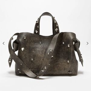 Musubi tote bag made of leather with a brushed vintage finish and stud details. Adorned with a musubi knot on each side, inspired by traditional Japanese obi sashes.