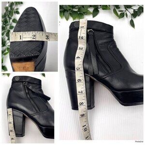 90mm-3.5" heel 30mm-1" platform Upper: calf leather Almond toe Zipped side and snapped side tab Leather insole and sole in black.