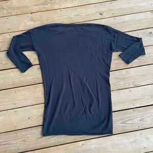 Navy blue lightweight semi-sheer sweater. Sleeves are 3/4 length. Tunic length. Rolled hem. Fabric content tag is missing but feels like linen or linen blend but I'm not totally sure what the fabric content is.