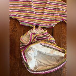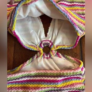 ACOA knit multicolor striped dress w/ circle ring that connects top and bottom of dress “That 70s Dress”