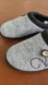 Soft gray slippers with black trim. Features a floral accent. Ideal for home comfort.