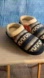 Warm knit slippers with a navy and cream pattern. Perfect for cozy indoor wear. Size 8-9