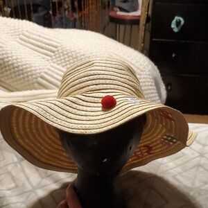 Elevate your style with this chic tan wide-brimmed hat, featuring a striking red accent. Perfect for sunny days and adding a touch of elegance to any outfit.