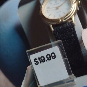 Timeless gold watch with a black strap. Perfect for any occasion.