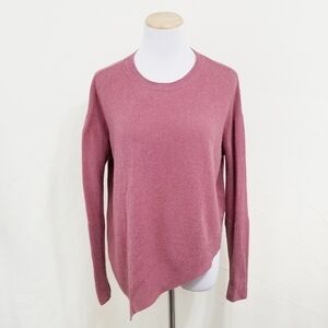 Acrobat asymmetric hem wool jumper in rosewood. Dark dusty pink knit sweater. Wool / viscose / nylon / cashmere. Crew neck collar. Ribbed knit trim. Pullover. Long sleeves. Size small.