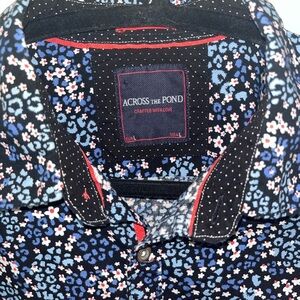 Chic floral and polka dot button-up shirt by Across the Pond. Features a vibrant pattern with blue, white, and red accents.