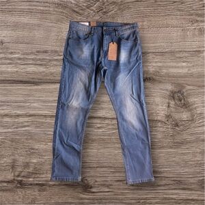 Across the pond. Signature line men Skinny jeans blue size 33w 30 L 65 % Cotton 33% polyester Across the Ponds" brand, size 34/32. Based on the visual appearance and search results mentioning similar items, the jeans appear to be a light wash denim, possibly in a slim or straight fit. The jeans have a tag attached, suggesting they are new or unworn. The size 34/32 indicates a waist size of 34 inches and an inseam length of 32 inches. The overall style suggests casual wear.