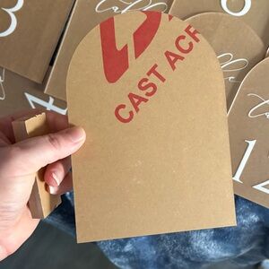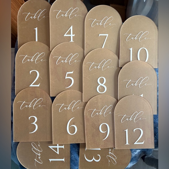 Set of arched table number signs (1-14). Acrylic with white scripted "table" and bold white numbers. Clean, modern wedding or event signage. Easy to display or prop on tables. Comes with the stands. Never used!