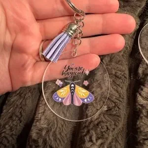 Clear handmade acrylic keychain featuring a colorful moth design and a purple tassel. Perfect for adding a magical touch to your keys.