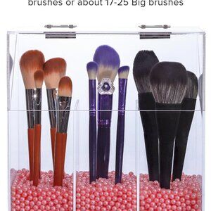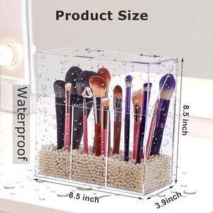 Large Capacity -- Our makeup brush organizer for vanity is handcrafted with 3mm thick acrylic material, providing a sturdy frame for daily usage. With its Large Capacity and effective size measuring 8.5" L x 3.9" W x 8.5" H, this acrylic makeup brush holder with lid provides ample space to hold various sizes of brushes, cosmetics, and other beauty accessories. you can store up to 50 small or 25 big brushes. A sturdy frame ensures that your belongings stay secure and organized.