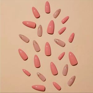 Medium length, almond-tip acrylics - some solid peach, others clear/natural nailbed look with peach and gold glitter accents - you receive 24 nails