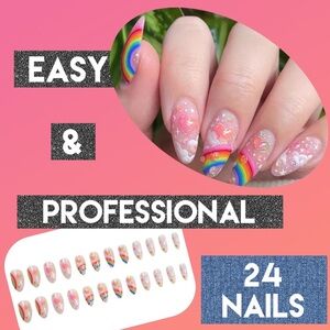 Medium length, almond-tip acrylics - rainbows, frosted hearts, puffy clouds and drawn in bubbles that have a 3D effect - add a dot of clear glue or a bubble sticker to accentuate! It’s super adorable - you receive 24 nails