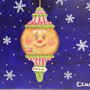 This image displays a Christmas-themed painting featuring Santa Claus's hand gently holding a festive gingerbread man ornament against a dark blue background filled with white snowflakes and red accents. The painting is signed "CYNDEE," likely indicating the artist. Original design of Gingerbread Ornament Only based on design by Chris Haughey. The overall design of the entire canvas was made by the painter.
