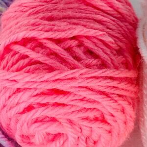 "Lot of 4 skeins of four-ply acrylic yarn in multicolor pink, lavender, blue, and white with sparkle. Perfect for crafts or DIY projects, these skeins are partially used and missing paper sleeves. Two skeins are rolled into balls. The white yarn features sparkles, and the lavender yarn includes mixed color accents. Amounts vary."
