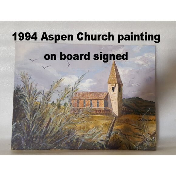 Acrylic painting of the Aspen Church, dated 1994 and signed. I cant make the signature out. The first initial is B. rest could be beu, Breu or something similar. It's short. No frame, it's on board. Measures 12" x 9".