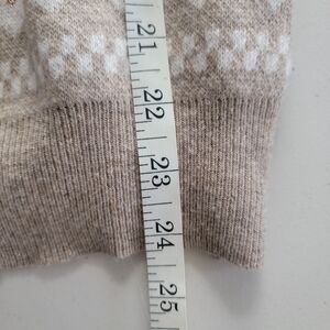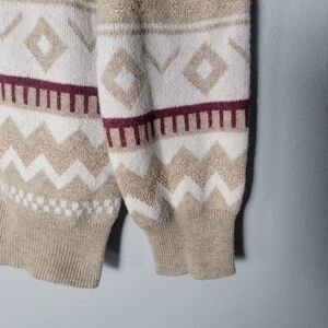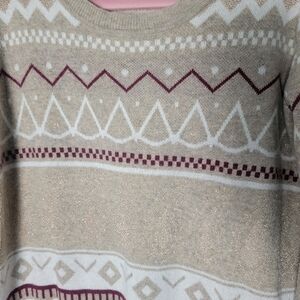 No size tag or tags in item. Feels like acrylic with sparkle thraed throughout. Tan, cream, red and gold sparkle. Pergwct for fall and holidays.