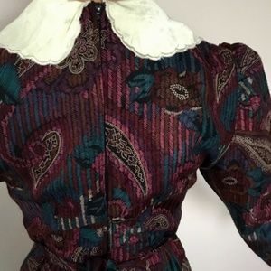 Act I vintage floral collared dress, ties and zips in back. Size 3 but runs small/petite. Model is 5’4” and usually wears a 0/2.