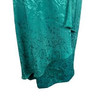 The Act I Vintage Floral Satin Print Short Sleeve Blouson USA Made Green Dress in size 4 is a stylish and elegant choice for a business occasion. Made of polyester, this midi-length dress features a high neckline with a button closure, short sleeves with slit type accents, and a collarless design. The vintage floral pattern adds a touch of charm, making it perfect for the spring, summer, and fall seasons. With its made-in-USA quality and attention to detail, this dress exudes sophistication and is sure to make a statement.