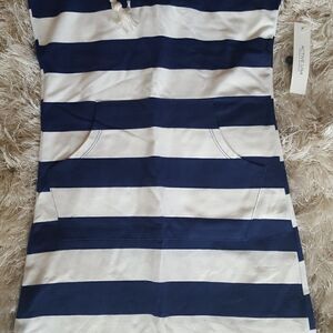 Women's Sleeveless Striped Midi Dress Hooded Front Pocket White & Blue