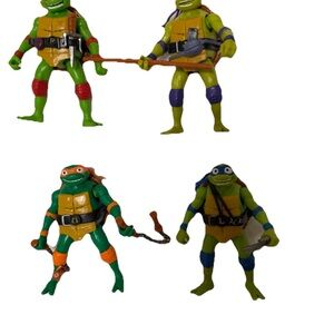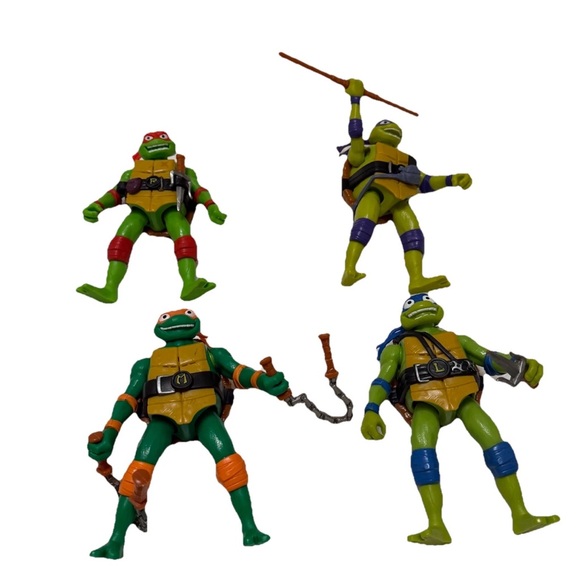 Dive into adventure with the action figure set. Featuring vibrant green figures with red, orange, blue, and purple accents, these toys are perfect for imaginative play. A must-have for any TMNT fan!