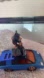 Action figure with a green cape on a blue toy car. Perfect for collectors.