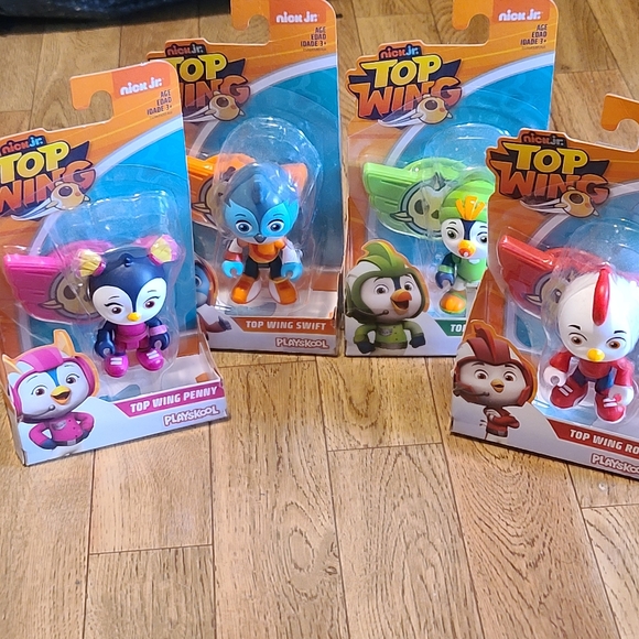 Set of 4 Nick Jr Top Wings Figures. Includes Swift, Brody, Penny and Rod. Each figure measures about 3" in height and includes a wearable badge.