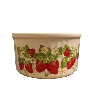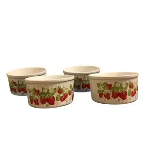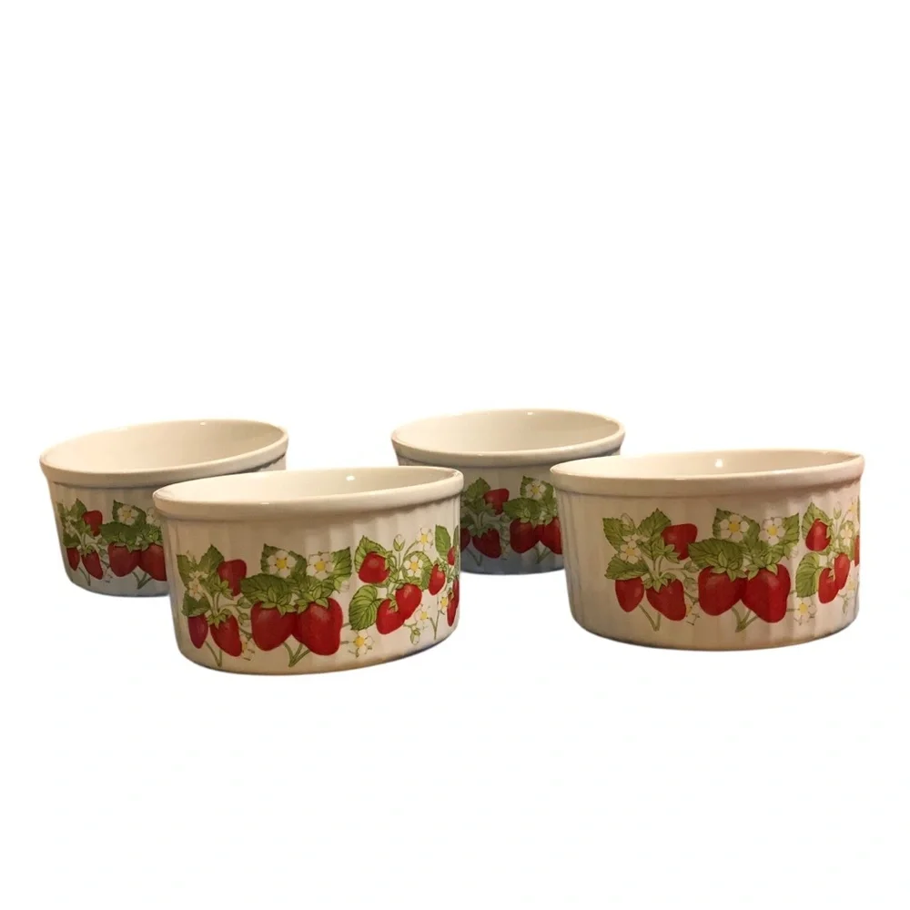 4” Ramekin single serve soufflé cups. Enhance your kitchen with these charming strawberry patterned ceramic ramekins. Perfect for serving desserts or snacks. The vibrant red and cream design adds a touch of elegance to any table setting.