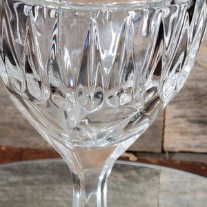 Action of Yugoslavia 24% Lead Crystal Water Goblet 7". Heavy lead crystal. Pressed glass. Vertical lines on the Bowl. Band around top. Stem is 6 sided and measures 3". Bowl is 3 1/2" x 3 1/2". Pedestal is thick and raised. Nice heavy feel in hand.