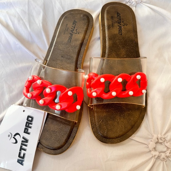 Red Chain with white pearls sandals.