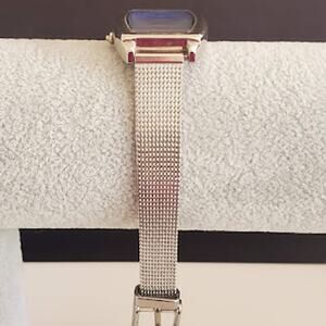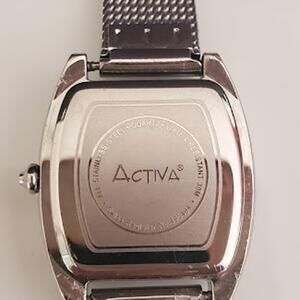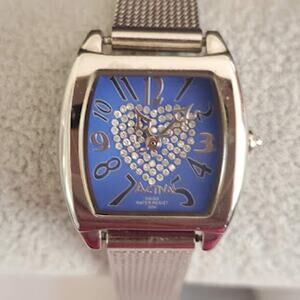 Activa ladies swiss movement watch has a blue dial with a crystal heart. Band is flexible silver tone mesh. There's minor scratching on the bezel, crystal is scratch free. Overall condition is very good. Currently running with a fresh battery.