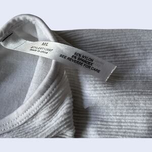 Minimalist ribbed tank in light heather gray with a flattering V-neck front and scoop back. Soft, super-stretch nylon-spandex rib knit hugs and smooths—great for layering or athleisure. Y2K/basic-core look with clean lines and a close fit. Condition: Excellent.