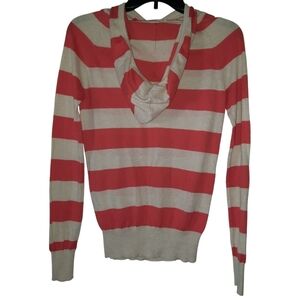 Active hooded sweater in size medium. The sweater is 60% cotton and 40% polyester. Hand wash cold and dry flat. Long sleeves. Striped and multicolored in cream and coral. Thin, sheer, lightweight, soft, stretchy, and smooth feeling. Features a drawstring hood, pullover style, kangaroo pockets on the front, and cuffed sleeves and waistband.