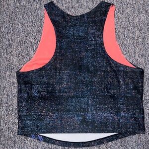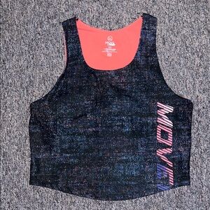 Active work out tank top with a built in sports bra, makes for an easy go to work out top. Scoop neck, curved longer hem in front, shorter straight hem on back.